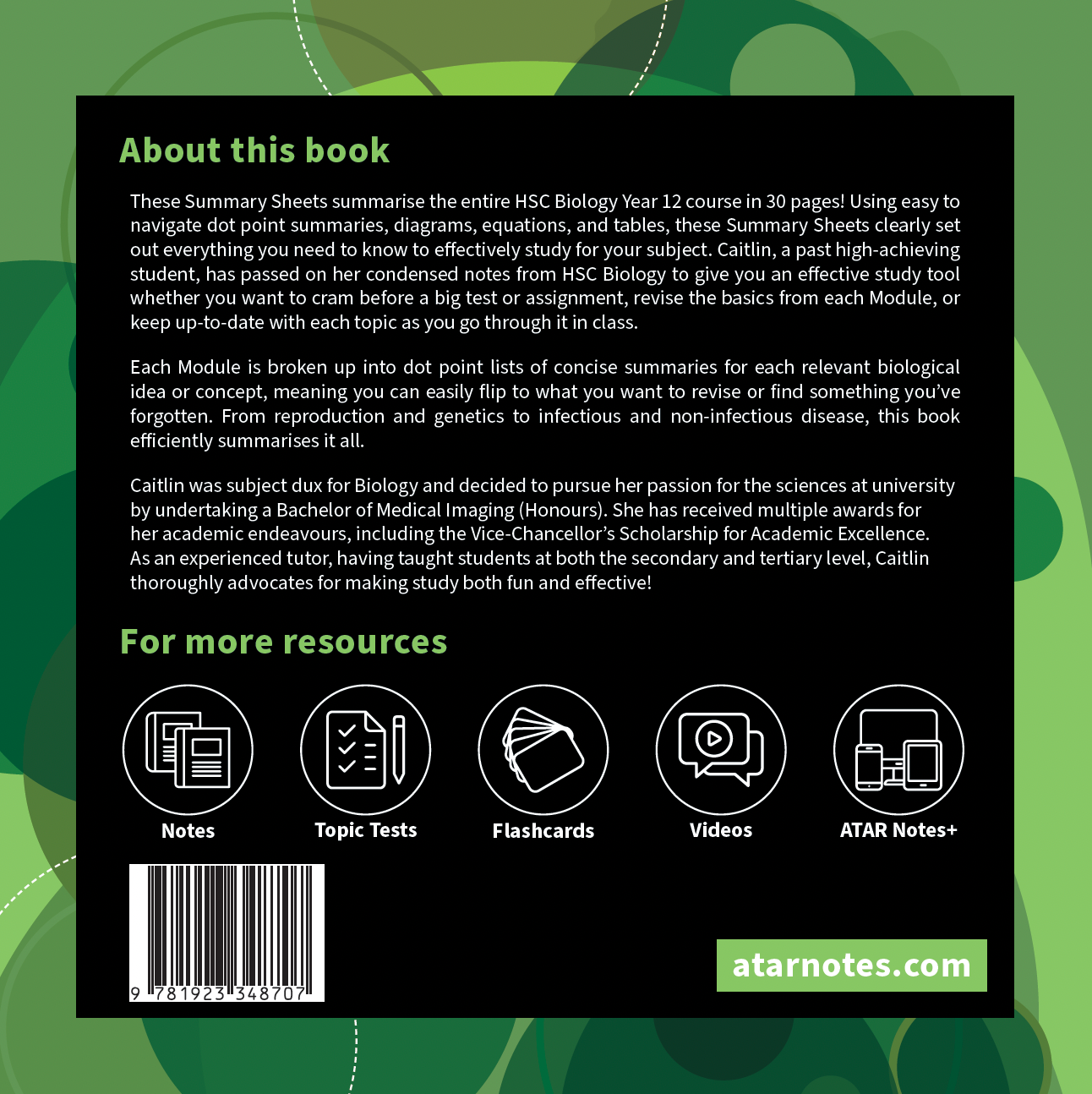 These Summary Sheets summarise the entire HSC Biology Year 12 course in 30 pages! Using easy to navigate dot point summaries, diagrams, equations, and tables, these Summary Sheets clearly set out everything you need to know to effectively study for your subject. Caitlin, a past high-achieving student, has passed on her condensed notes from HSC Biology to give you an effective study tool whether you want to cram before a big test or assignment, revise the basics from each Module, or keep up-to-date with each topic as you go through it in class.