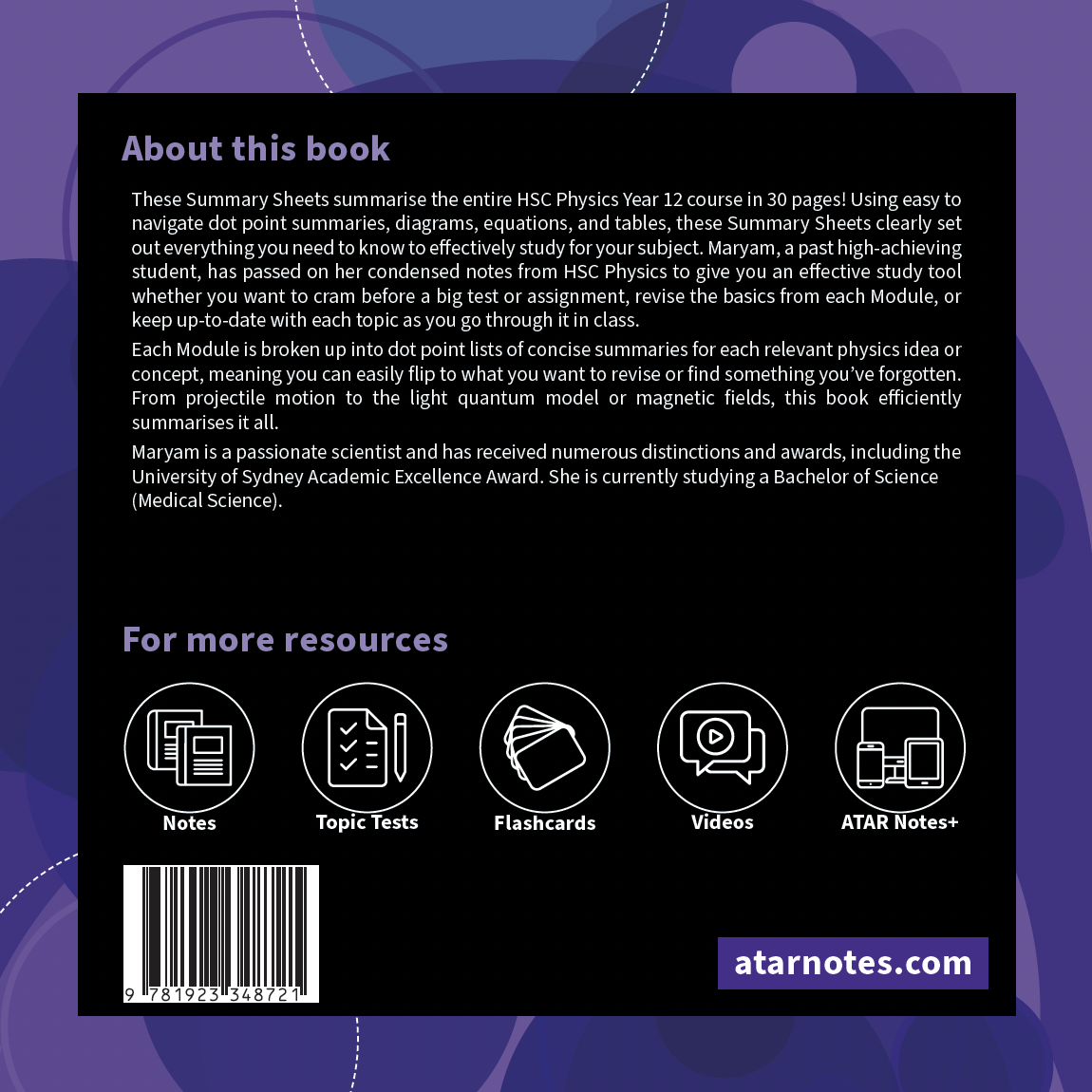 These Summary Sheets summarise the entire HSC Physics Year 12 course in 30 pages! Using easy to navigate dot point summaries, diagrams, equations, and tables, these Summary Sheets clearly set out everything you need to know to effectively study for your subject. Maryam, a past high-achieving student, has passed on her condensed notes from HSC Physics to give you an effective study tool whether you want to cram before a big test or assignment, revise the basics from each Module, or keep up-to-date with each topic as you go through it in class.