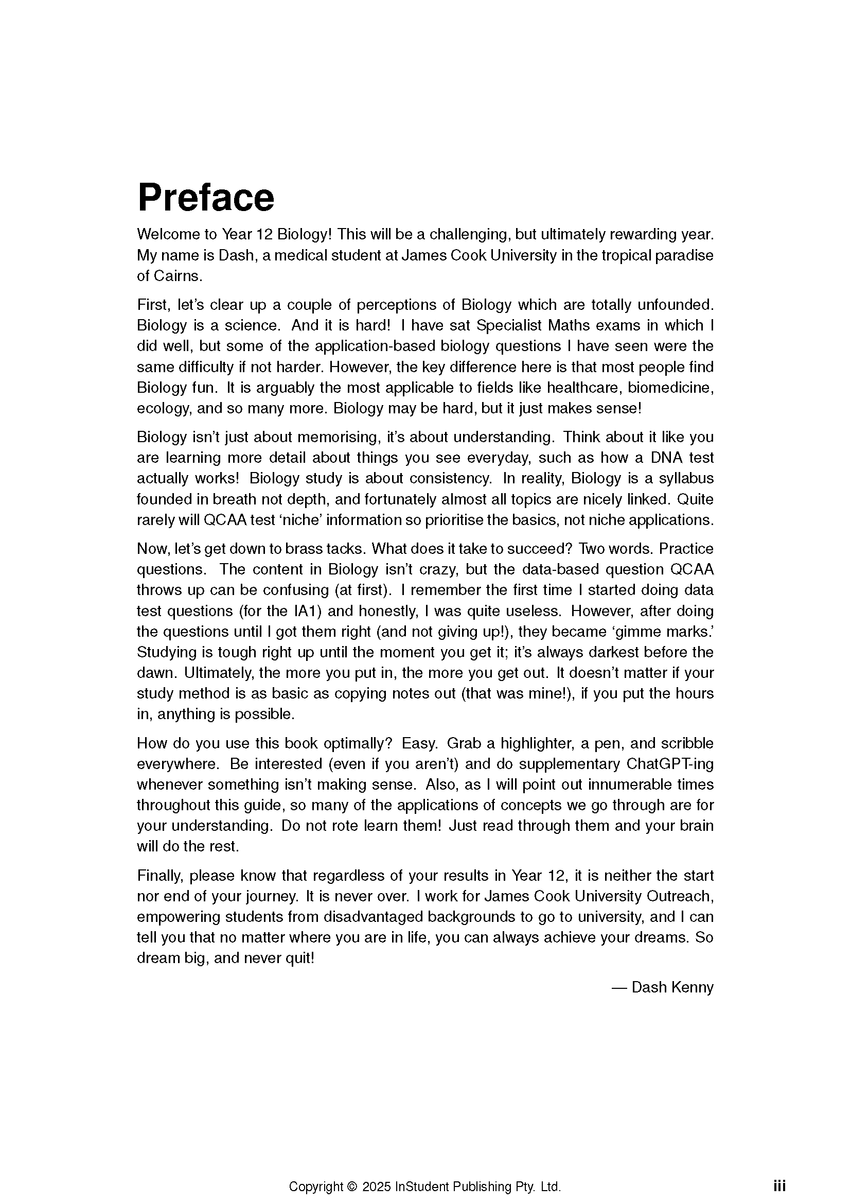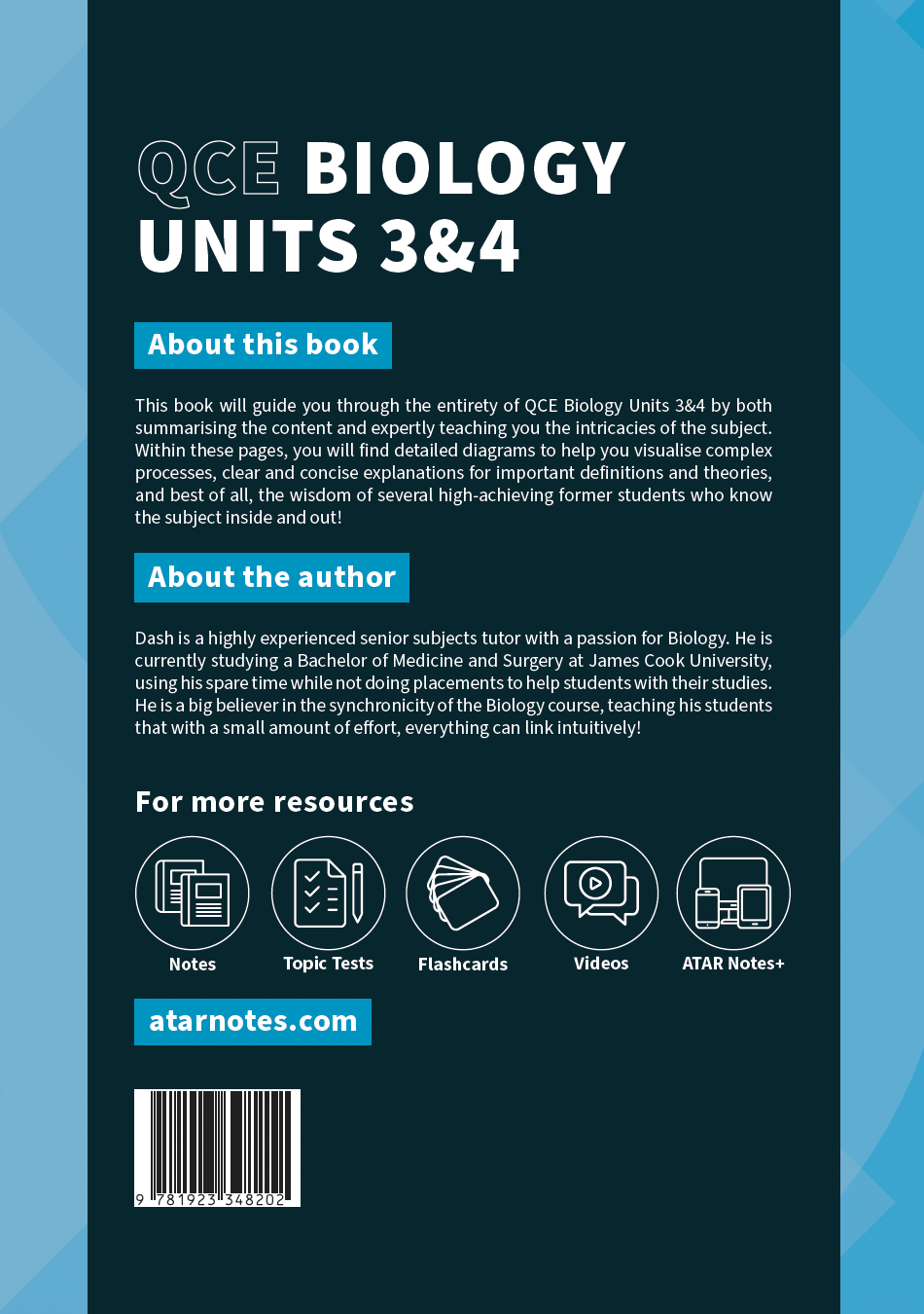 This book will guide you through the entirety of QCE Biology Units 3&4 by both summarising the content and expertly teaching you the intricacies of the subject. Within these pages, you will find detailed diagrams to help you visualise complex processes, clear and concise explanations for important definitions and theories, and best of all, the wisdom of several high-achieving former students who know the subject inside and out!