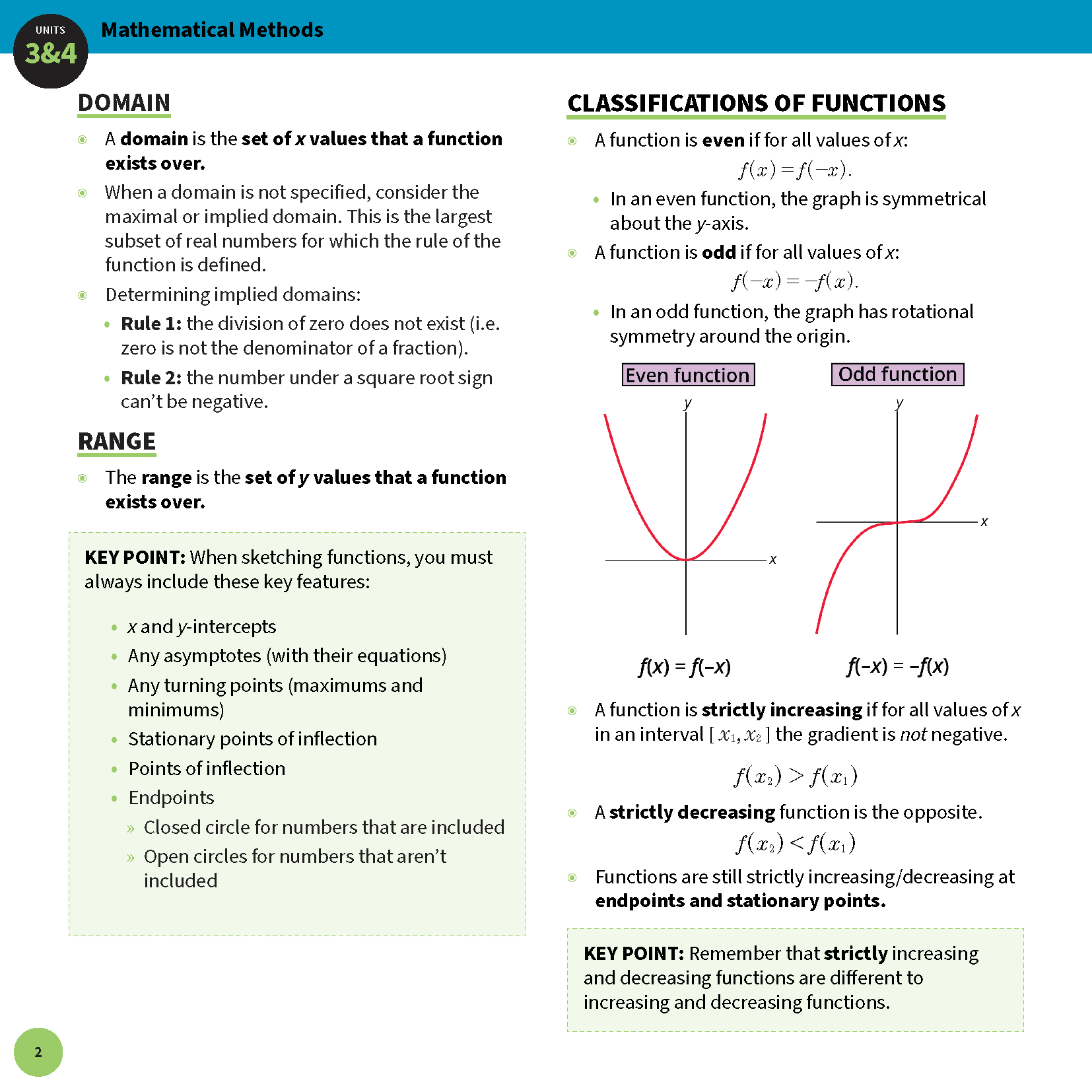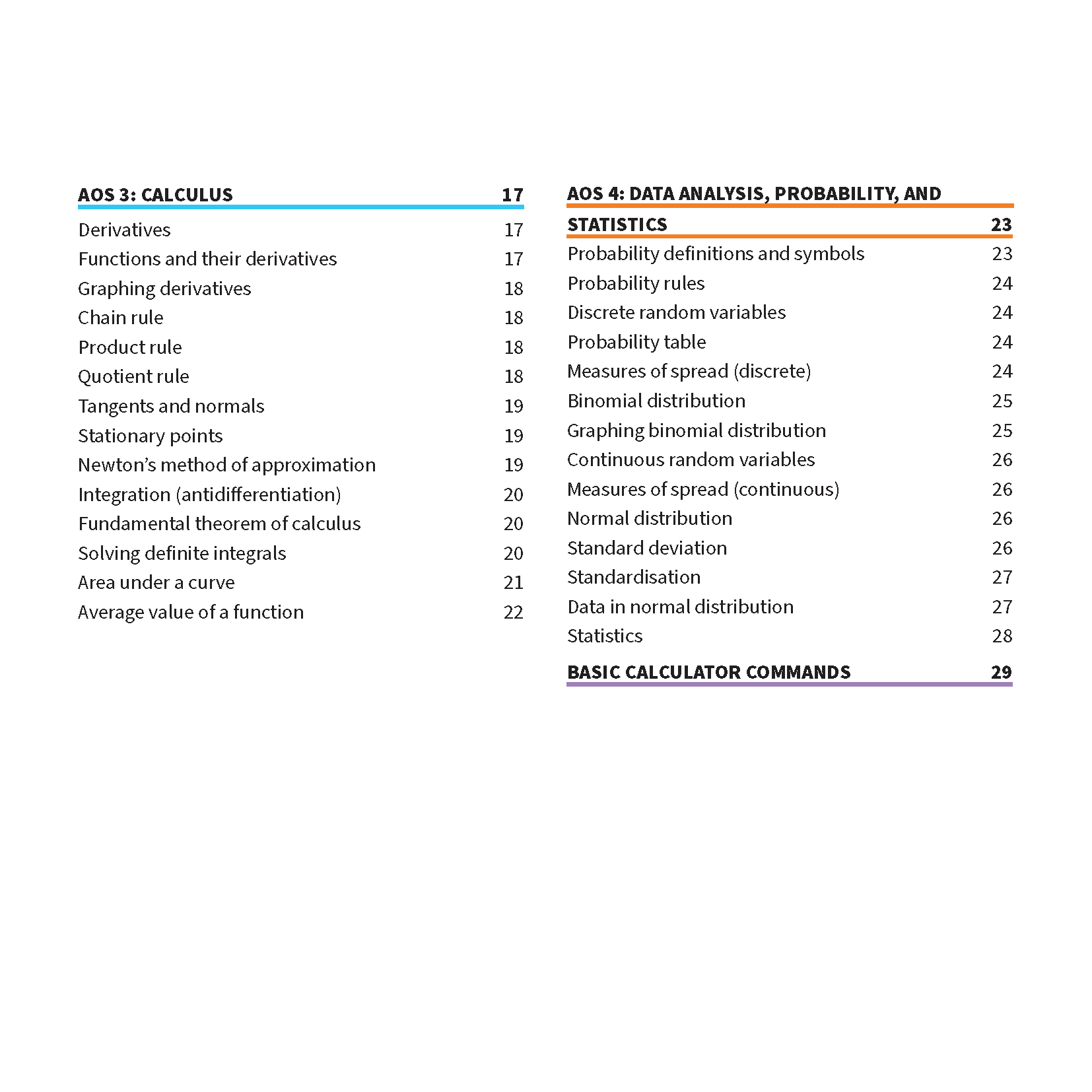 Each AOS is broken up into dot point lists of concise summaries for each relevant mathematical idea or concept, meaning you can easily flip to what you want to revise or find something you’ve forgotten. From functions to probability, these notes succinctly summarise everything in your Units 3&4 course. There is even a handy resource for using your calculator at the end of this book!