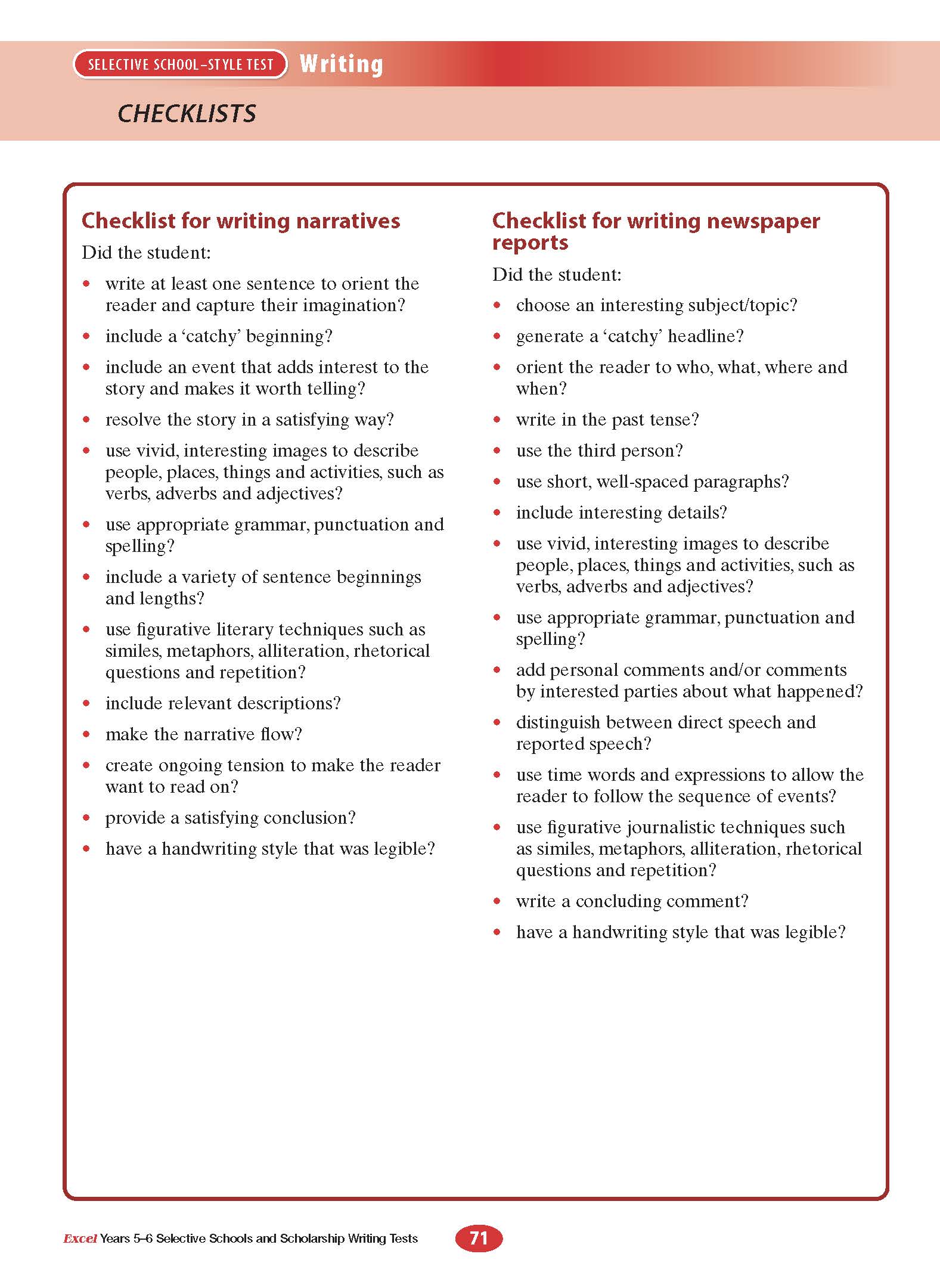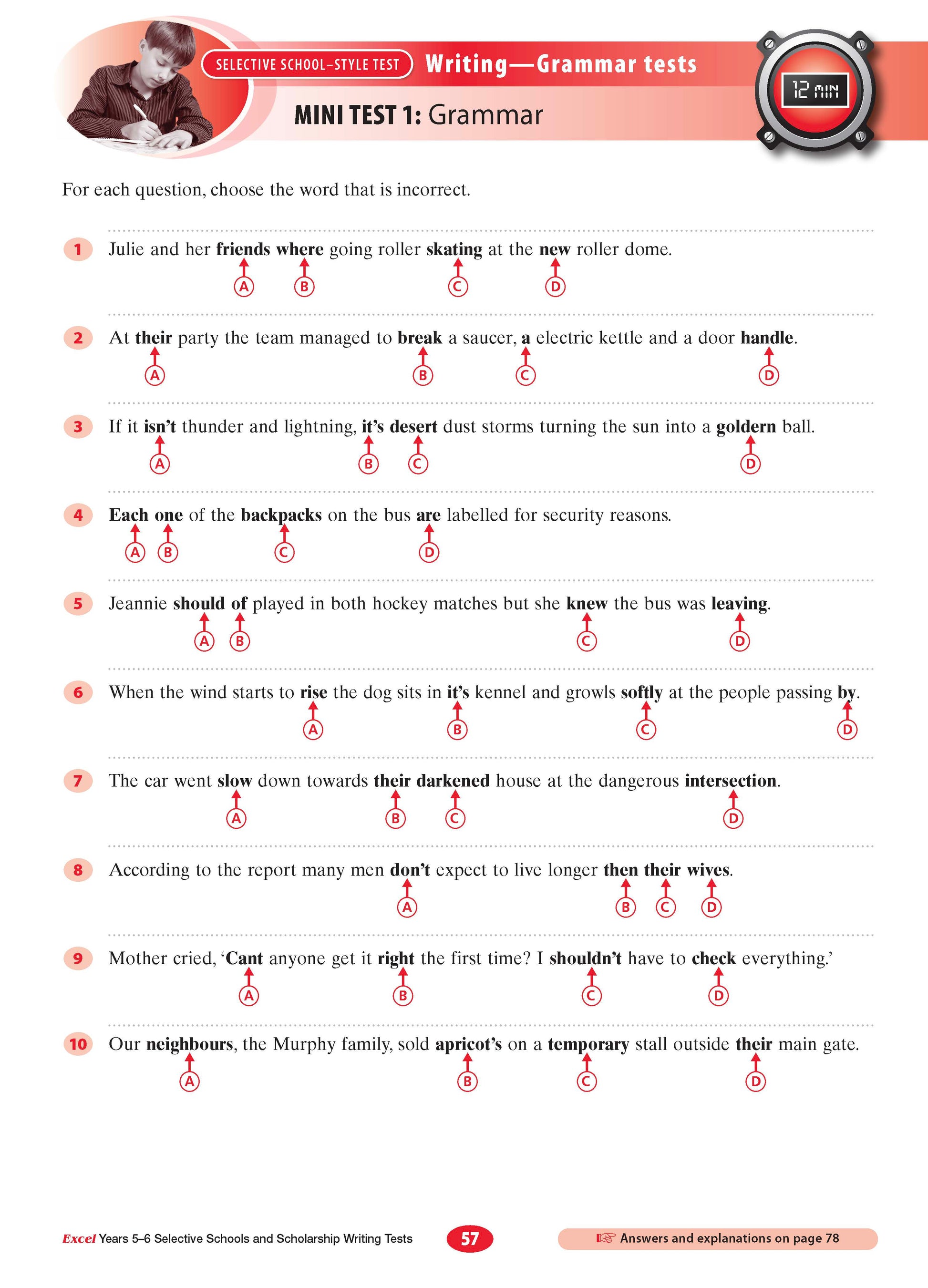 Excel Selective Schools and Scholarship Writing Tests Years 5-6 is a comprehensive study guide for English Comprehension part of the Selective Schools and Scholarship Tests (usually undertaken in Year 6). This title includes over 60 practice tests on spelling, grammar, vocabulary and editing written by the experienced author Alan Horsfield.