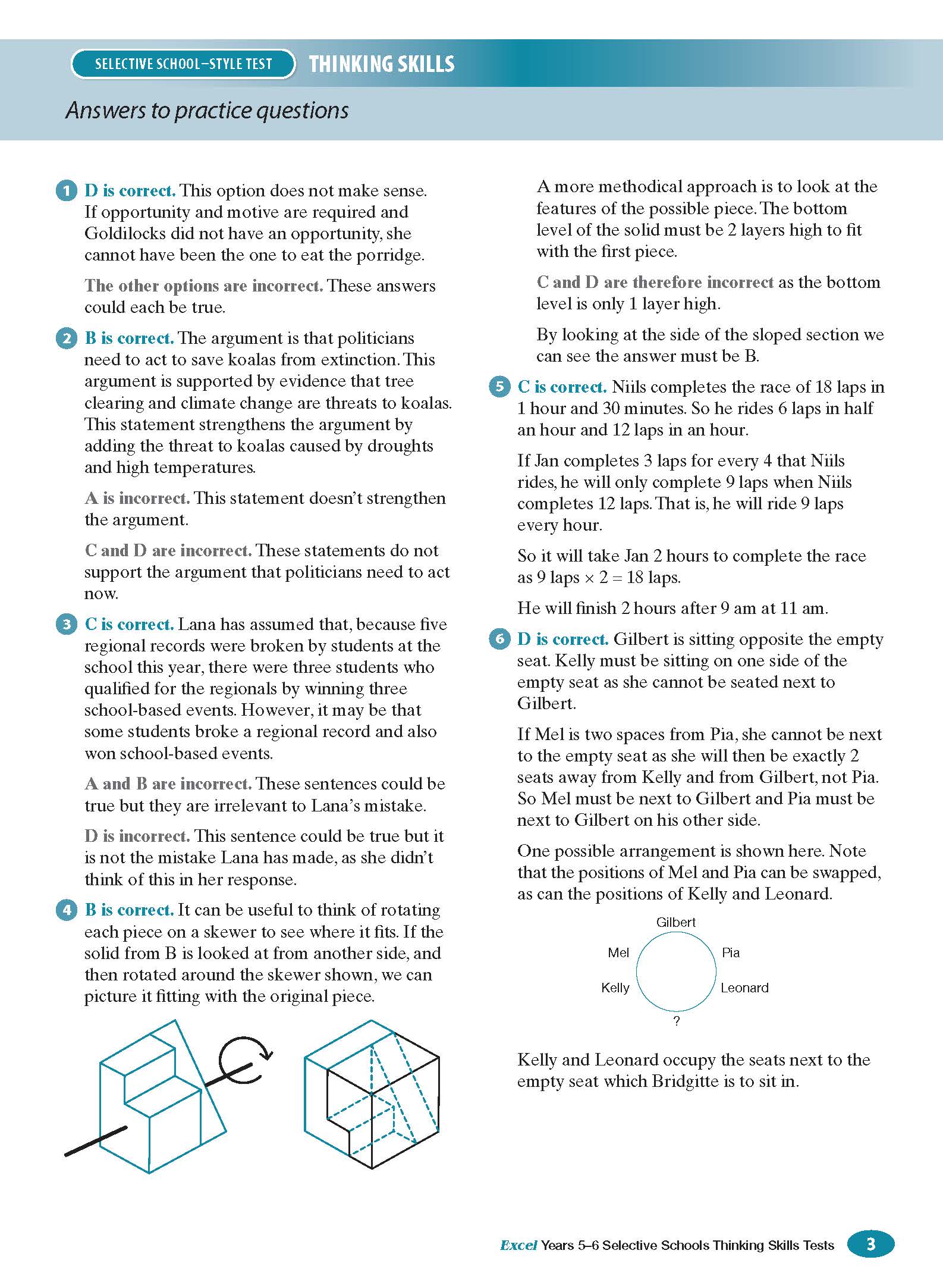 Excel Selective Schools Thinking Skills Tests Years 5-6 is a comprehensive study guide for the Thinking Skills part of the Selective Schools and Scholarship Tests. This title includes practice questions with helpful hints on tackling Thinking Skills questions