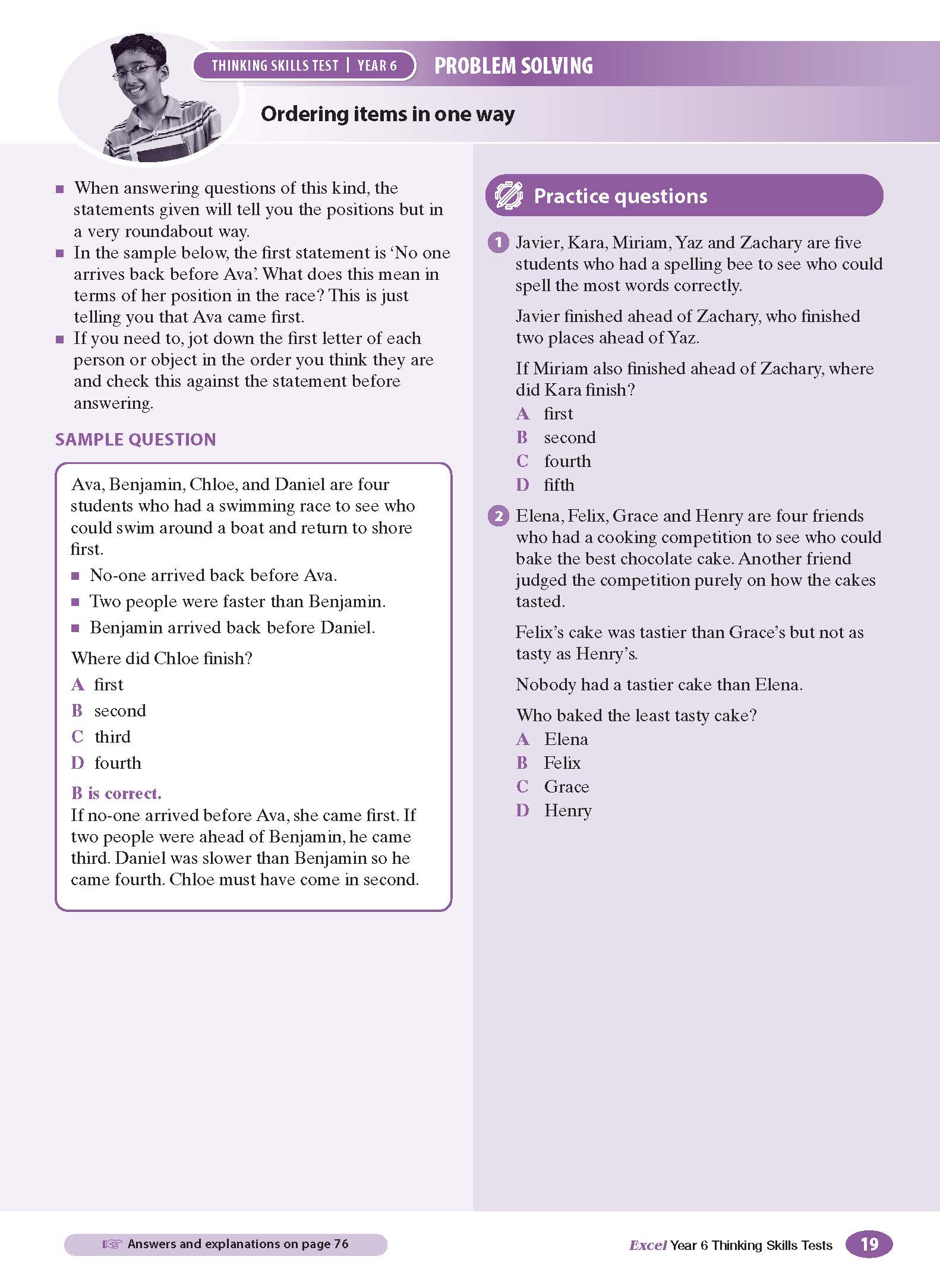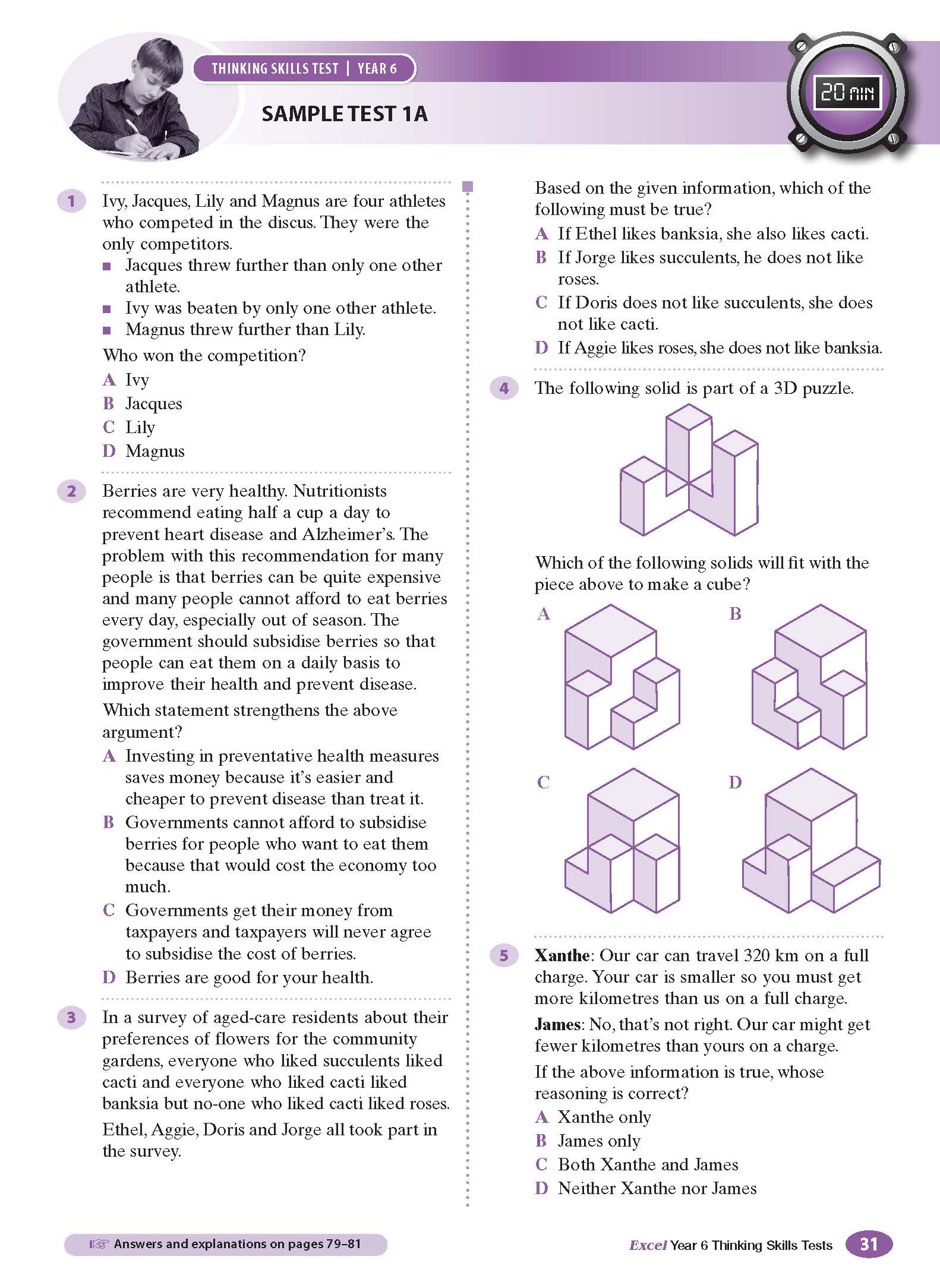 Excel Excel Test Skills - Thinking Skills Tests Year 6 is designed to help students feel more confident in taking Thinking Skills Tests, which are tests in the Year 6 NSW Selective High School Placement Test, and to enable them to learn the necessary skills required to answer each type of question. It will also help support students with general practice of critical-thinking and problem-solving skills.