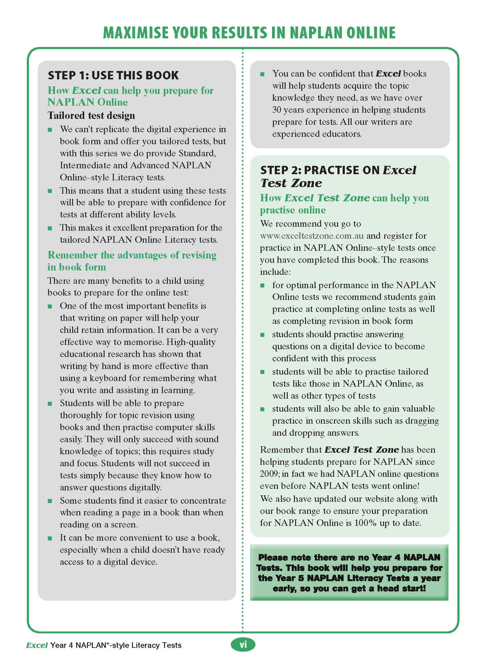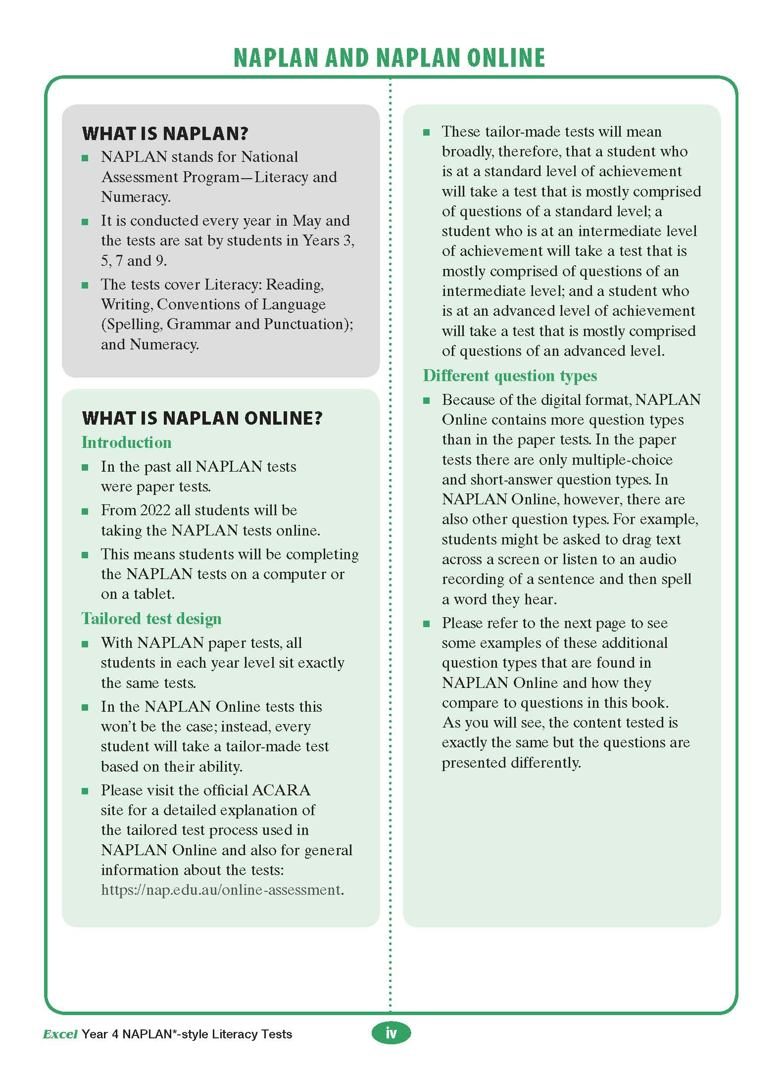 Support your child with complementary Online Practice Tests for Year 4 from Excel Test Zone, Australia's number one online practice site! Your child will become familiar with the NAPLAN Online format with hundreds of questions to practise and detailed answers and explanations for every question!