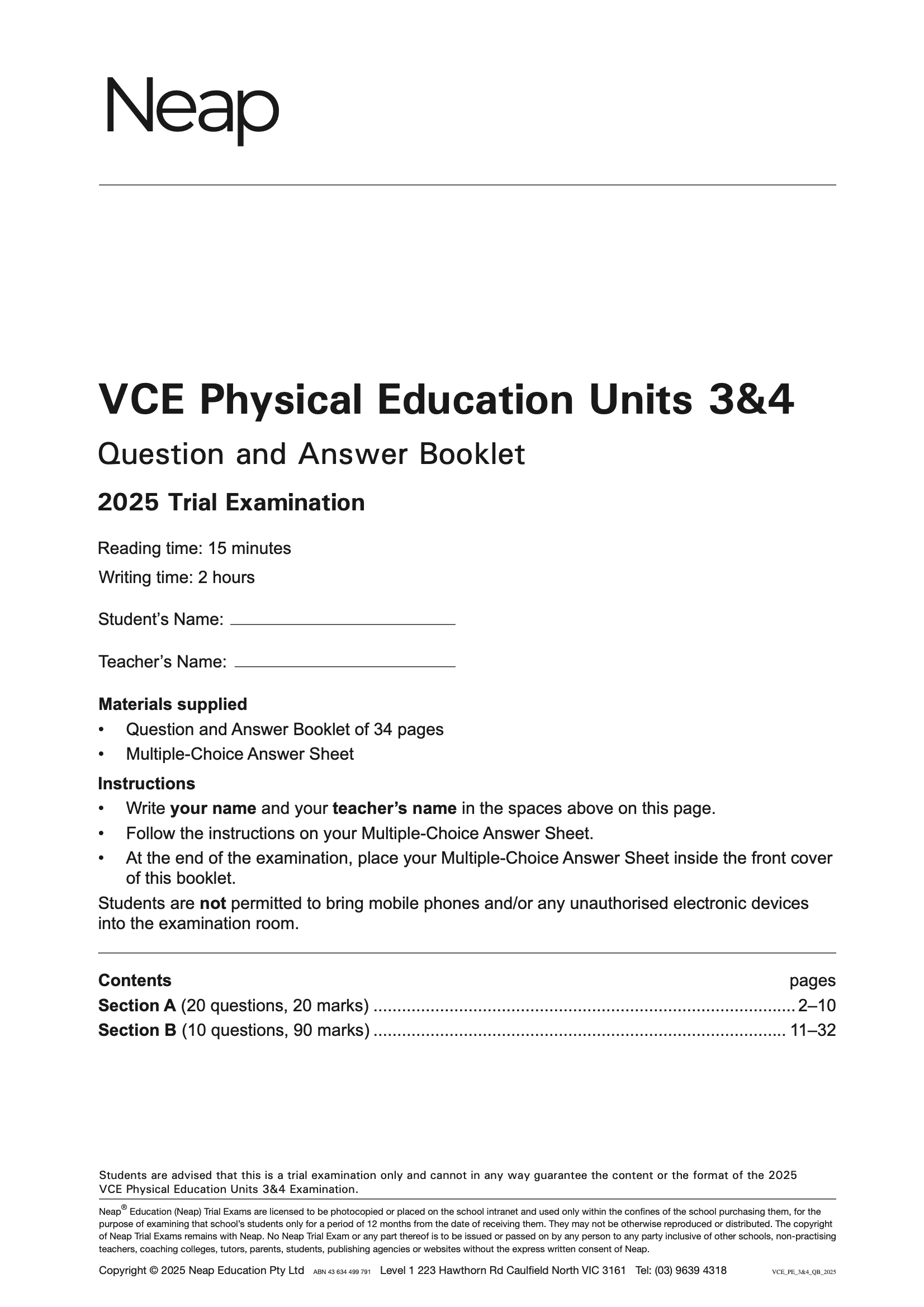 Neap Practice Exam: 2025 VCE Physical Education (PE) Units 3&4 (Digital)
