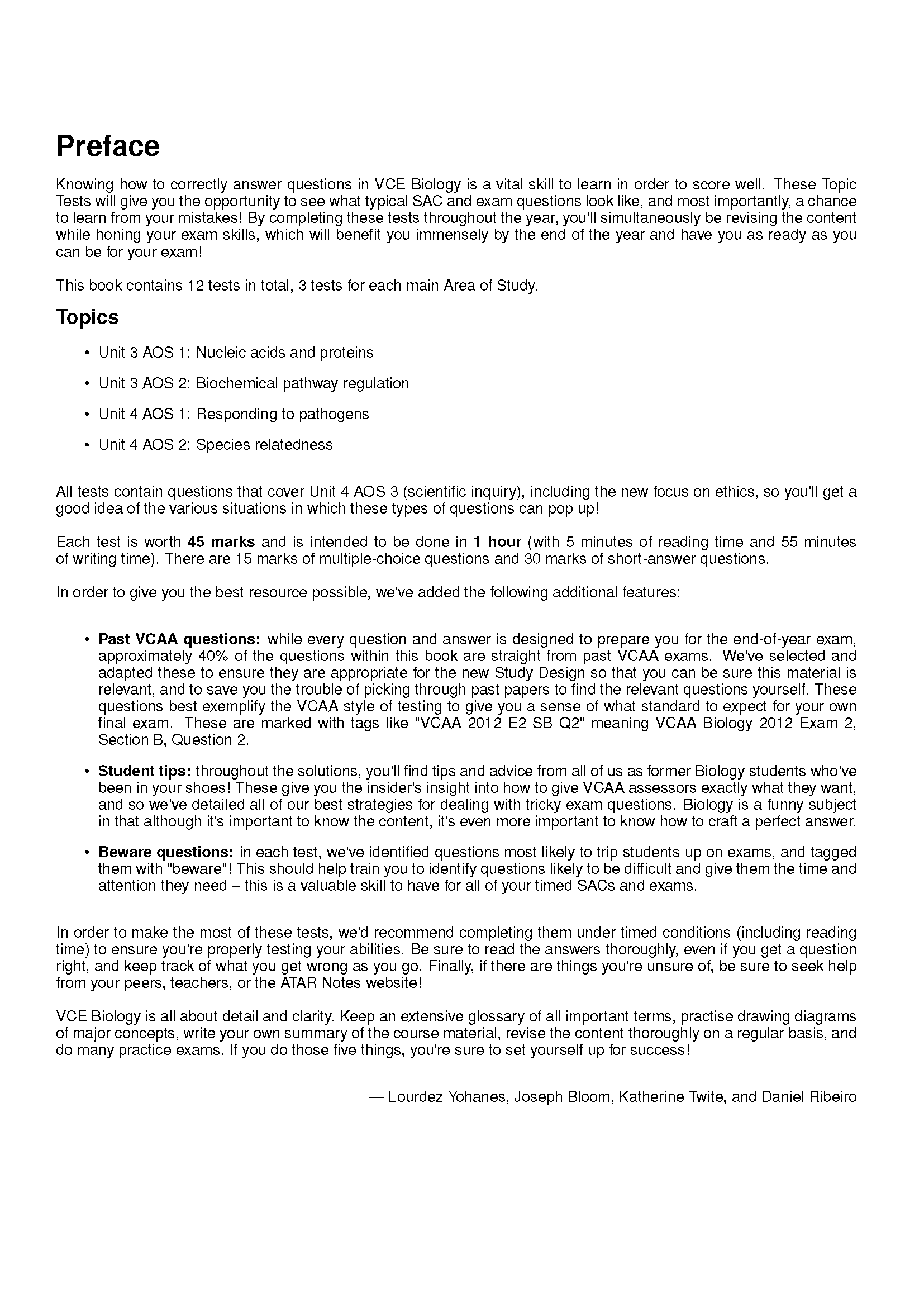 This book contains 12 tests covering every Area of Study in VCE Biology 3&4, including questions from past exams, and original questions specifically designed to help you understand the intricacies of this subject. Best of all, for every question, you will find a detailed solution and step-by-step instructions for approaching similar questions in your assessment tasks, as well as expert advice from those who have excelled in their studies.